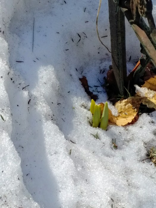 Nature – life, finds a way. How true a statement that is indeed. Despite the snow surrounding the tender shoots, daffodils are triumphantly sprouting towards the glorious spring sunshine, unabated and unabashed. Another month and they’ll be fading away, allowing the peonies to step into their deserved late spring spotlight.